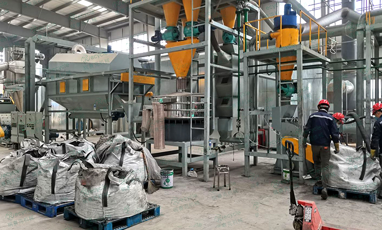 具體實施工藝,廢舊鋰電池進入撕碎機進行撕碎,撕碎后的電池進入專用破碎機進行破碎,將電池內部正負極片及隔膜紙打散,打散后的物料經氣流分選機和磁選輸送機進行分選,以便能夠選出鐵磁性物質,后續的粉碎機、分析機、搖擺篩、研磨機、旋振篩以及比重分選機對磁選后的物料再次進行破碎、研磨、分選以及篩分,使其粒徑更小,滿足回收需求,并且每個裝置均連接有脈沖除塵器和引風機,避免污染因子過多排放,更加環保。,并設有整體的黑粉收集系統,避免黑粉泄露和資源浪費,統一收集。